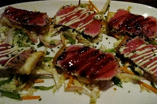 We got our appetizer shortly after our drinks, the Yellow Fin Tuna that came on top of crispy wontons with an asian slaw. A little sloppy to eat, but still delicious.